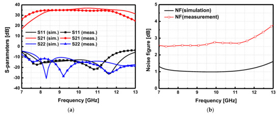 The implemented LNA was measured to evaluate the noise figure (NF) and S-parameters. The gate bias voltage was VGG = −2.1 V, and the drain supply voltage was VDD = 10 V. With this condition, the four-stage LNA consumes 1.0 watts. Figure 18a shows the comparison between the simulated and measured results of the S-parameters of the LNA. The 3 dB bandwidth was 4.4 GHz (7.6–12 GHz) with a peak gain is 34.9 dB at 9 GHz. The input and output return loss was better than 10 dB. The NF of the LNA was measured with the Y-factor method. Figure 18b presents the simulated and measured NF, which shows a large discrepancy between them. The measured NF at 9 GHz was 2.56 dB, and the maximum NF over the 3 dB bandwidth was 3 dB. It is noted that there is a large NF discrepancy between the simulation and measurement. The root cause of this discrepancy is an inaccurate device noise model provided by the PDK.