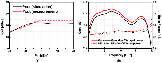A large signal measurement was also conducted to check the output power of the LNA. Figure 19a shows the output power of the LNA at 9 GHz, the saturated output power is 24.5 dBm and a 1-dB compressed input power (IP1dB) is −18 dBm. Due to the drain limiter at the final stage of the LNA, output power does not exceed 25 dBm, as it is expected in the simulation. To verify the robustness of the implemented LNA to the large input power, S-parameters of the LNA were measured before and after applying the input power of 6.3 watts (100 μs of the pulse width and 10% of the duty-cycle) to the implemented LNA several times at X-band as shown in Figure 19b. There was no noticeable degradation observed after applying the high input power to the LNA. The proposed LNA is compared with other reported X-band GaN LNAs as shown in Table 3. Since the proposed LNA is required to achieve a more than 30 dB gain, four cascaded stages consume a relatively large power consumption (1.0 watts). Considering its high gain performance, the power dissipation is acceptable.