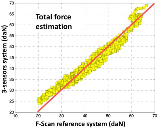 We observed a good accordance between the Total Force estimate measured by the F-Scan and that calculated by the anatomical model using a set of three sensors, especially for normal and high-pressure levels (30 to 70 daN). For low-pressure levels, the relative errors are more important, probably due to the lack of calibration of the reference system.