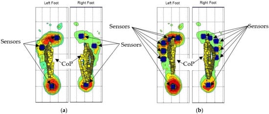 In the case of our model, the sensors are placed in key locations under the foot, as described above. These include stationary positions such as heel and forefoot. However, as described in our method, the determination of the CoP is mathematically independent of the sensor position. Therefore, tests were carried out for different sensor positions under the foot. The results show a non-significant difference.