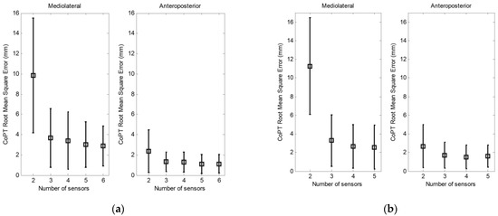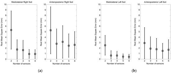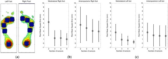 Figure 6b,c also shows the RMS and the standard deviation of mediolateral and anteroposterior CoP displacement under each foot for a set of two to five sensors.