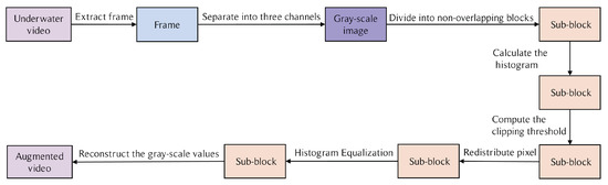 In underwater environments, the contrast of the underwater videos is usually low, which causes interference with the feature information of the objects. To solve this problem, we recover more feature information in the underwater video by enhancing the contrast to improve the detection effect. Contrast Limited Adaptive Histogram Equalization (CLAHE) is an adaptive histogram equalization method, which divides the input into small blocks and then performs limited histogram equalization. Blocking and limiting contrast before equalization can avoid overexposed areas and suppress noise. Therefore, we use the CLAHE method to enhance the contrast of the underwater video.