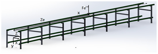 The track is fixed on the truss by fasteners. To simplify the model, the track is regarded as an infinite Euler-Bernoulli beam. It can be seen from the schematic diagram of the track shown in Figure 4 that the tracks of the conveyor have upper and lower levels. In this work, only the upper track is studied to simplify the calculation, ignoring the mutual influence between the upper and lower tracks, and the fasteners are treated as a spring with a damping structure.