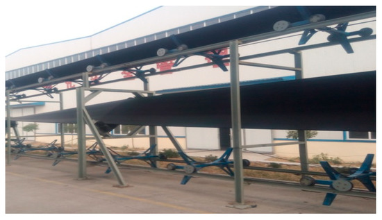 Belt conveyors play an important role in solid bulk material transport systems and have the advantages of long-distance continuous transportation, large transportation volume, and small environmental impact. Research on belt conveyors is increasingly inclined to intelligent-monitoring and energy-saving technologies [1,2,3,4,5,6,7,8]. However, traditional belt conveyors are associated with energy consumption due to large running resistance. The rail conveyor recently developed [5,6,7] effectively combines the benefits of low friction resistance, low energy consumption for wheel-track transportation, continuous material transport, and large capacity for belt conveyors. It is a new type of energy-saving conveyor system with great development potential.