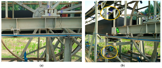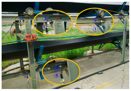 To comprehensively test the vibration characteristics of the conveyor, the test is divided into three parts. The measured positions or working conditions were the axial and vertical directions of the track and the truss and the locations of the different welds of the track. In view of the above three situations, the sensor layout and field test were carried out at the different measuring points, detailed as follows.