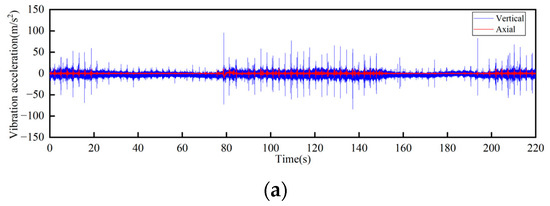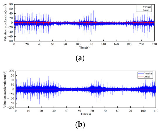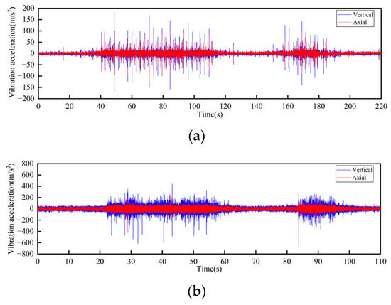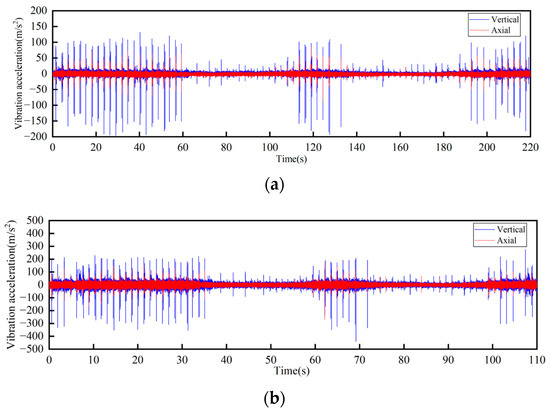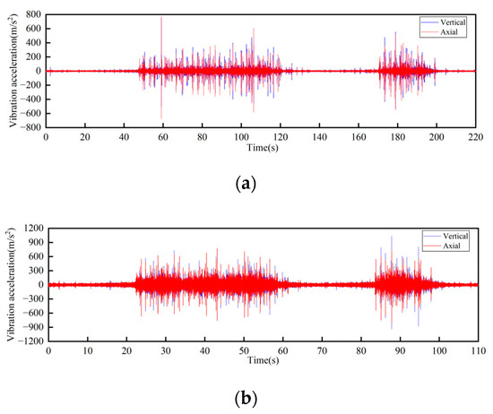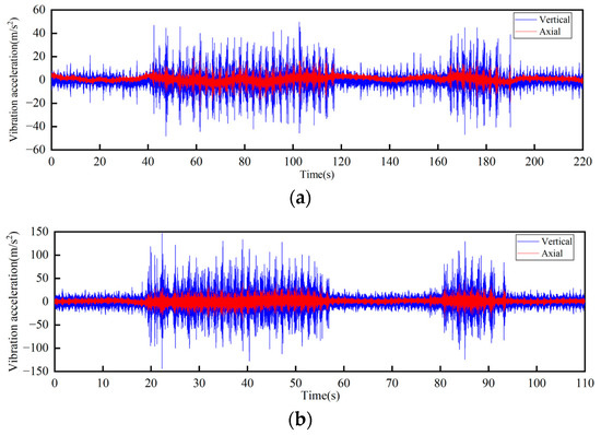 Time-domain curves of vibration acceleration at the relatively larger weld of rail joints under different operating speeds: (a) Speed 1 m/s; (b) Speed 2 m/s.