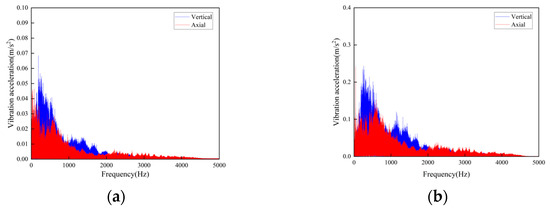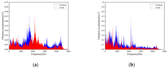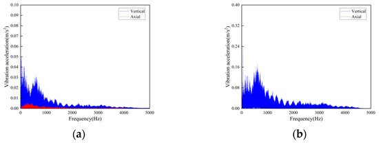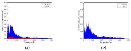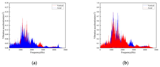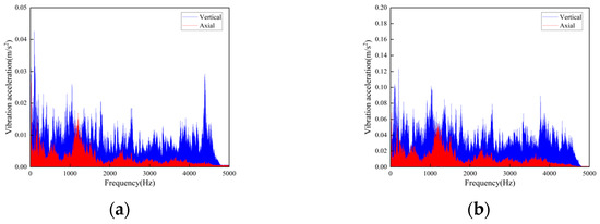 Frequency-domain curves of vibration acceleration at the flat weld of rail joint under different operating speeds: (a) Speed 1 m/s; (b) Speed 2 m/s.