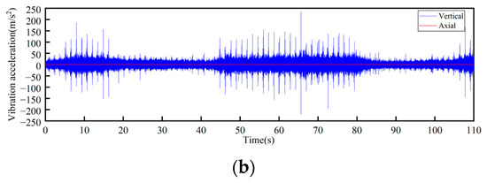 Time-domain curves of vibration acceleration measured at the rotating shaft above the side beam of the vertical turnaround wheel of the machine head: (a) Speed 1 m/s; (b) Speed 2 m/s.