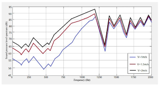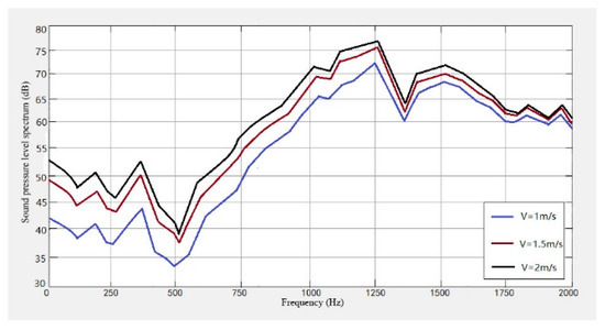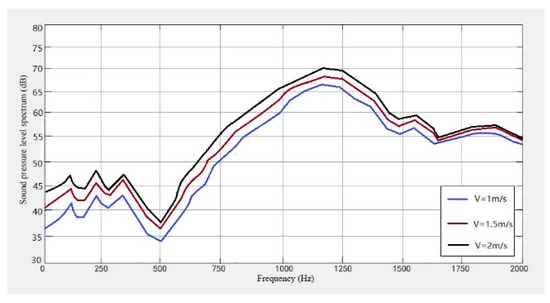 According to the wheel and rail parameters given above, the sound pressure levels of the rail conveyor at the operating speeds of 1 m/s, 1.5 m/s, and 2 m/s were predicted. The test results show that the noise levels at the head and the tail sections of the system are higher than that in the middle section but tend to be consistent with the increase of speed, so only the middle section was taken for study. The predicted noise levels of the middle section of the conveyor at different operating speeds are given as follows.