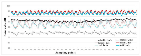 Noise values of head, tail, and middle sections under the speeds of 1 m and 1.2 m, respectively.