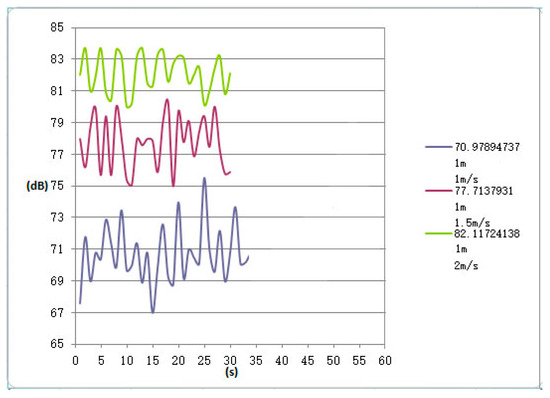 Figure 24 and Figure 25 show the measured noise curves on site. The on-site measurement environment and steps are as follows: The distance between the conveyor supporting carriages is 2 m, which can be operated cyclically on the track through the vertical turnaround wheels at the head and the tail of the system; the carriage-wheel material is cast iron; the parallel distance between the measuring point and the track is 1 m, the height of the measuring point is 1.2 m, and each test time is 30 s. The noise levels of the conveyor head, tail, and middle sections were then measured and analyzed, respectively, under several different operating speeds. Figure 24 shows the measured noises of the head, the tail, and the middle sections at operating speeds of 1 m and 1.2 m, respectively. It can be seen that the noise values at the head and the tail sections fluctuate more obviously. The peaks of the noise curves in Figure 24 are the noises measured when the supporting carriages were passing the measuring point, while the curve troughs the noises are measured when the previous carriage left and the next carriage had not reached the measuring point. Figure 25 shows the variations of the noises with time at the conveyor’s head part under different operating speeds. It can be seen that there are obvious vibration peaks when the supporting carriages pass the measuring point.