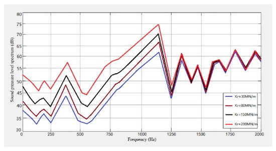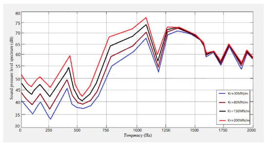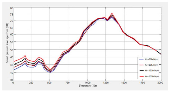 It can be seen from Figure 26, Figure 27 and Figure 28 that the noise of the system increases with the increase in the fastener stiffness under the stiffness of 30 MN/m, 80 MN/m, 150 MN/m and 200 MN/m. When the frequency is lower than 30 Hz, the stiffness has little effect on the noise. In the range of 30 Hz–1000 Hz, the noise sound level will increase with the increase in stiffness. When the frequency is greater than 1500 Hz, the track noise spectrum curve tends to be stable, and the stiffness has no effect on the noise.