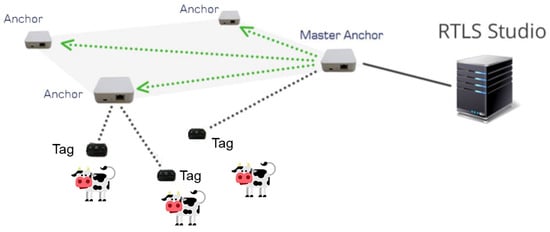 Measurements were carried out in a laboratory (13.8 m × 5.40 m) by the use of a real time UWB-based location system (SEWIO, Brno, Czech Republic). The SEWIO UWB system consists of anchors, tags and the software RTLS Studio (Figure 1). The SEWIO system is a UWB technology based on the time difference of arrival. The SEWIO system has two types of UWB communication based on two layers. The first layer is named the blink layer where the communication occurs between the anchors and tags. The tags send UWB messages (i.e., blinks) to the anchors; then, the anchors receive these UWB blink messages, process the received information, and send information to the RTLS server. Finally, RTLS Server computes the precise position by using the UWB blink message.