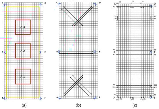 Different experimental trials were carried out to acquire data by simulating the position and movement of the cows (Figure 1). In the first experiment (Figure 2a), the x and y coordinates of points located in the central areas (i.e., A1, A2 and A3) and on the perimeter of the laboratory were acquired. In the second experiment (Figure 2b), the x and y coordinates of points approaching and moving from anchors were recorded. In the third experiment (Figure 2c), the x and y coordinates of points at different tag velocities were acquired. In detail, dynamic points were acquired at dynamic paths of 0.2 m s−1 and 1 m s−1 to simulate slower and faster movement of the animals along the service and feeding alleys [8]. The dynamic paths are the longitudinal and transversal paths shown in Figure 2c.