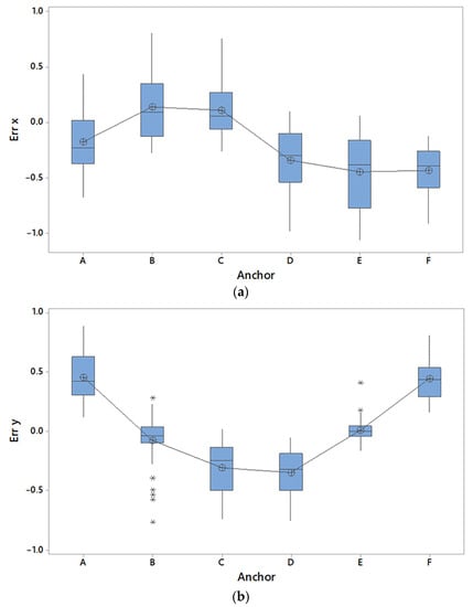 Based on the two-way ANOVA, errors Ex and Ey were not influenced (p > 0.6) by the movement of the tag (i.e., approaching and moving from anchors) and the interactions between the movement of the tag and the position of the anchors. Results (Table 2) related to Ex and Ey coordinates of investigated points approaching and moving from anchors showed that the errors were influenced only by the position of the anchors in both x and y directions (p < 0.001). The accuracy related to anchors F and A was the lowest and related to anchors C and B were the highest. Based on Figure 3, the boxplot showed that Ex was overestimated in anchors B and C, whereas the measurements were underestimated in anchors A, D, E and F. The highest Ey (Figure 3b) was recorded in anchors A and F, whereas the lowest Ey was recorded in anchors C and D.