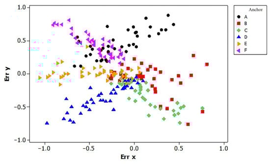 In detail, the scatterplot in Figure 4 shows the distribution of the Ex and Ey when a tag was approached or was moved from a specific anchor. Based on the correlation analysis, Ex and Ey had a great correlation for anchors A (r = 0.73 and p < 0.001), C (r = −0.82 and p < 0.001), D (r = 0.89 and p < 0.001), F (r = −0.89 and p < 0.001). It was found that Ex and Ey are directly proportional in anchors A and D, whereas Ex and Ey are inversely proportional in anchors F and C. The regression analyses showed R-adj2 higher than 70% only for anchors D and F with R-adj2 equal to 78.6% and 78.1%, respectively. The anchor E showed error only along the x axis and, consequently, there was not a significant correlation between Ex and Ey in E with p = 0.9. The errors related to B showed higher distribution compared to those acquired in other anchors and, thus, results in Figure 4 showed a deviation of the path. This is related to the position of the anchors on plan distribution. For this reason, it is of utmost importance to an accurate position of the anchors because slight differences in the installation process (i.e., tilt angle) could increase errors.