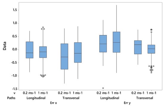 Under dynamic conditions, the errors Ex and Ey ranged from −1.29 m and 0.89 m, and −1.47 and 2.81, respectively. The results of the linear regression describe a significant relationship between the x (or y) measured coordinate and the x (or y) real coordinate under dynamic conditions with p < 0.001 for both coordinates. The regression equation for the x coordinate is xmeasured = 0.31 + 0.82 xreal with the adjusted coefficient of determination R2adj equals 98.0%. The regression equation for the y coordinate is ymeasured = 0.22 + 0.99 yreal with the adjusted coefficient of determination R2adj equals 99.5%. The simulation on dynamic movements (Table 3) showed that there was not a significant difference (p > 0.05) between Ex (or Ey) at different tag velocities for longitudinal paths, whereas there was a significant difference (p < 0.001) between Ex (or Ey) at different tag velocities for transversal paths. In detail, higher errors were recorded when the tag was moved at 0.2 m s−1. The boxplot in Figure 5 shows that Ex and Ey for velocities at 0.2 m s−1 in transversal paths had the widest range. With regard to accuracy, a significant difference was found between different tag velocities for both longitudinal and transversal paths (p < 0.001). The highest accuracy was found when a tag was moved at 0.2 m s−1 in longitudinal paths and at 1.0 m s−1 in vertical paths.