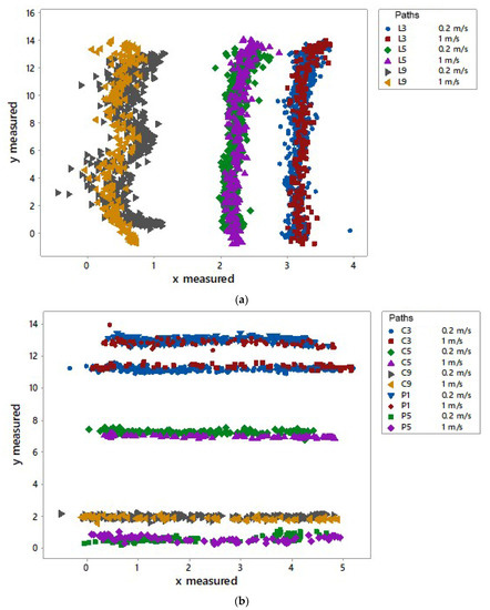 Scatterplot of the coordinates recorded by UWB system in specific longitudinal (a) and transversal (b) tag’s paths.