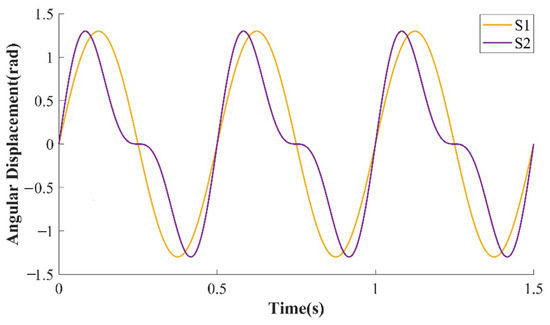 Angular acceleration amplitude and motion frequency errors are used as calibration items in [9] and China standardization JJF 1210-2008—Calibration Specification for Rate Table [11]. As shown in Figure 1, and both are curves of angular displacement of the LFAART varied with time and is an ideal sinusoidal curve. Although the maximum angular acceleration amplitude and frequency of and are the same, their angular motion is quite different. Total harmonic distortion (THD) can quantify the difference. For example, the THD of is 0% while is 25%. Thus, adding the THD as an index can comprehensively reflect the non-ideality of LFAART’s sinusoidal motion.