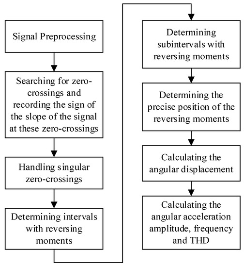 This paper has improved the earlier method, and the reversing moments have been estimated accurately to specific data points. The improved algorithm contains eight steps, as shown in Figure 2. The first four steps and the angular acceleration amplitude and frequency calculation method are similar to [9]. Thus, the improved algorithm is mainly described in the following part, including determining subintervals with reversing moments, determining the precise position of the reversing moments, calculating the angular displacement, and calculating the THD.