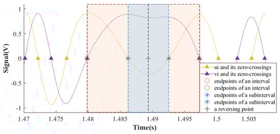 Figure 3 is an example of an interval, a subinterval, and a reversing point. The red region is an interval; the blue part is a subinterval, and the mark “+” is a reversing moment. In Section 3.1, the determination of a subinterval like the blue part in Figure 3 has been elaborated. This part explains obtaining a specific data point like the mark “+” in Figure 3. Firstly, one of the two signals output by OSE for subsequent calculation is selected according to the intensity of change in the subinterval. Two signals output by OSE after sampling and preprocessing are named as and vi, respectively, where is a positive integer, indicating the index of discrete signals. Let the indexes to the left and right endpoints of the subinterval be and . The changing intensity of in the subinterval is quantified as qujud, where