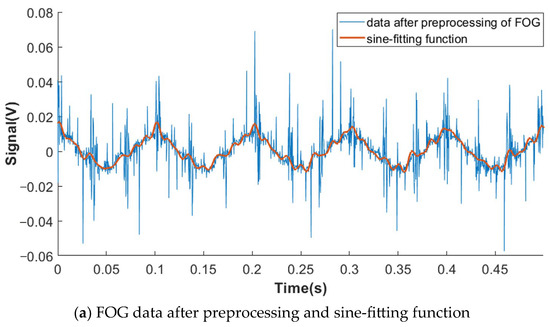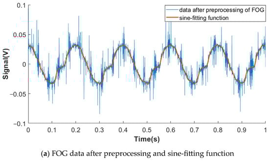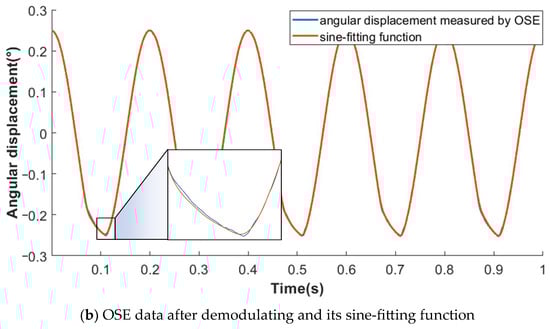 The difference value is just 0.11% with an angular motion amplitude of 0.1° and a frequency of 5 Hz. Moreover, the FOG data (after preprocessing) and sine fitting function are shown in Figure 6a. The OSE data after demodulating and its sine fitting function are shown in Figure 6b. Both gain a well-fitting effect. Thus, the measurement results of these two sensors are reciprocal and supportive.