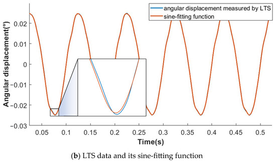 As shown in Table 1, the difference value between THD calculated by the proposed two-measurement scheme is within 0.11% except for the first experiment, validating the method proposed in Section 3 and Section 4. With an angular motion amplitude of 0.025° and a frequency of 10 Hz, the difference value between FOG and LTS is unacceptably huge. This is because the angular velocity of LFAART is relatively small, and then the SNR is quite low. So, the sine-fitting result is greatly influenced by serious noise, as shown in Figure 5a. Thus, comparing the results in such a situation is inappropriate, and the difference calculation does not make sense. However, from another dimension, we can conclude from Figure 5b that the sine-fitting function is close to the angular displacement measured by LTS, and the root mean square of their difference is 0.0001, indicating the credibility of the THD calculation result based on LTS.