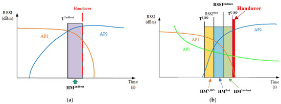 The algorithm of the OHA is described in Algorithm 1. When the system is started, the UE will start to search for nearby APs, start to collect the relevant information of these APs, and exclude the data of the AP that the UE is currently connected to from the collected data. Afterward, the UE will start to test the maximum throughput capability, and the severity of the packet loss problem between the server and itself will be the basis for further handover decisions. If the system finds that there are other APs nearby that can be handed over, it will start to check the current signal strength (RSSIC) of the connection between the UE and the AP. If the measured signal strength is greater than or equal to the threshold (T) set by the user, it means that it is in the “good signal condition range”, which means that its current connection signal quality is good and there is no urgent need to hand over (as shown in Figure 2a, and lines 3 to 7 of Algorithm 1). Note that the two curves in Figure 2a represent the RSSIs of AP1 and AP2, respectively. In this sense, the handover decision tends to reduce the probability of triggering the handover procedure. Conversely, if the measured signal strength is less than or equal to the threshold set by the user, this means that when it is in the “bad signal condition range”, we set an increased basis for decision-making for handover than in the good signal condition range, to prevent the UE from encountering poor connection or low service throughput (as shown in Figure 2a, and lines 9 to 13 of Algorithm 1).