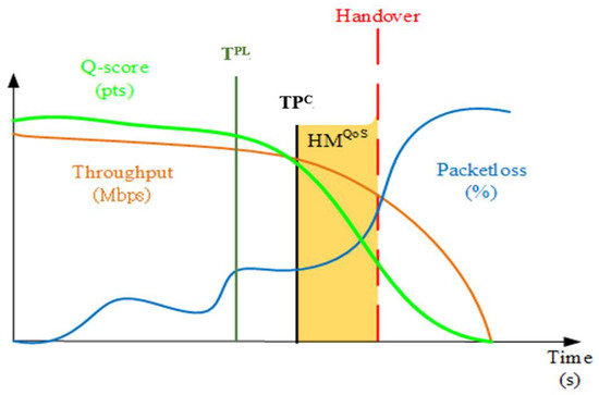 If the user enables the setting of high QoS requirements, the weight of handover decision parameters with high QoS requirements can also be set according to the attributes and requirements of the application used by the user. Through a weight-based handover decision such as that in [16], we designed a trade-off strategy between throughput and PLR based on user settings for different application scenarios. In the case of maintaining high throughput, if the current throughput (TPC) capacity between the UE and the currently connected AP is lower than the “minimum throughput requirement threshold (TQoS)” minus the “minimum throughput requirement HM (HMQoS)”, this will immediately trigger the handover procedure (as shown in Figure 3, and line 11 in Algorithm 2). At the same time, if a PLR handover decision parameter with a lower weight is set, the handover algorithm will also consider the PLR performance of the service network. If the low PLR exceeds the tolerable level according to the set weight, although the throughput performance is still within an acceptable range, the low PLR performance will further affect the user’s network experience. At this time, the handover procedure is also triggered to immediately alleviate the low PLR problem, thereby improving the user’s QoS. On the contrary, if the PLR is a network performance indicator that users attach more importance to, if the PLR is lower than the threshold set by the user, it will immediately hand over, and if the weight of throughput of the handover decision has been set, the throughput performance will also be considered, and the best execution timing for handover is determined based on its weight to ensure that the user can always have sufficient QoS during the use of the network. The Q-score curve in Figure 3 is the QoS score variation of each data sampling point obtained after the trade-off calculation of Equation (2).