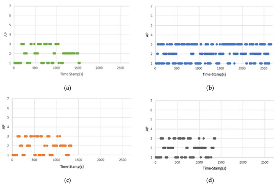 The relationship between the currently connected AP and time of the UE using different handover algorithms: (a) Mininet-WiFi; (b) DoTHa; (c) OHA; (d) OHAQR.