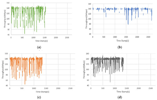 Throughput is the rate at which a UE successfully sends or receives messages. Note that “actual throughput” refers to the amount of messages transmitted per second during the entire experiment period, including the time of disconnection or inability to transmit. The “average throughput” refers to the amount of messages transmitted per second during the entire experiment period, excluding the time of disconnection or inability to transmit. In Scenario 1, the experimental results considering the actual throughput and the average throughput of the UE show that the actual throughput and the average throughput using the built-in handover algorithm of Mininet-WiFi were 81 Mbps and 127 Mbps, respectively (see Figure 7a). The actual throughput and the average throughput of the handover algorithm using DoTHa were 106 Mbps and 134 Mbps, respectively (see Figure 7b). The actual throughputs and the average throughputs of the handover algorithms using OHA and OHAQR were 106 Mbps, 131 Mbps, 123 Mbps, and 135 Mbps, respectively (see Figure 7c,d). The results show that when the UE was connected to the AP, the average throughput of various handover algorithms could maintain more than 100 Mbps, but the actual throughput of the built-in handover algorithm of Mininet-WiFi was only 81 Mbps.