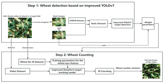 The overall process of video-based wheat-ear counting presented in this paper is shown in Figure 1. The video of wheat ears in a large field taken by an unmanned aerial vehicle was input, and the improved YOLOv7 model was used to detect and identify wheat ears frame by frame. The detection result was sent to the tracking module, which is responsible for building the link between frames to track one target. When the entire video is processed, a number of different ID values are obtained, which represent the required number of wheat ears.