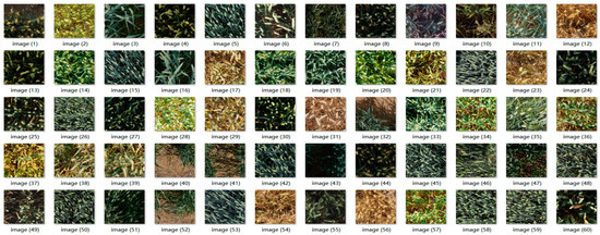 Firstly, a UAV was used to shoot the video of wheat in the field. While paying attention to the resolution, it functioned at a uniform speed. Secondly, the ffmpeg tool was adopted to process the video frame by frame. Then, it was cut into images, and the photos with blurred pixels and too dense or sparsely distributed images of wheat ears were eliminated. Among them, various types of images of wheat ears in the field were produced: 1056 pictures with severe obscurations, 724 pictures of different sizes, 482 images with uneven illuminations, and 248 images of the rest of the environment. Then, the Labelimg tool was used to label the wheat ears in the images to avoid mislabeling and omissions as much as possible. Moreover, the 4200 sieved images were divided into 3350 images in the training set, 550 images in the test set, and 300 images in the validation set, some of which are presented in Figure 2.