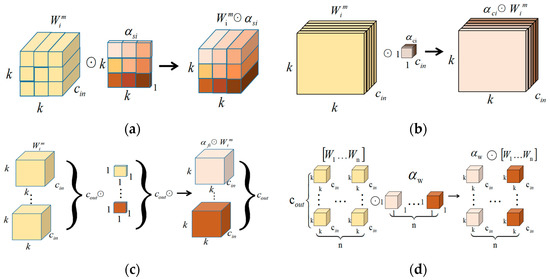 Four types of attention mechanisms in the ODConv network multiplied by the convolution kernel. (a) Multiplication of different positions along the spatial dimension, (b) multiplication operations along the input channel dimension, (c) filtering multiplication operations along the output channel dimension, and (d) kernel-wise multiplication along the kernel dimension of the convolution kernel space [25].
