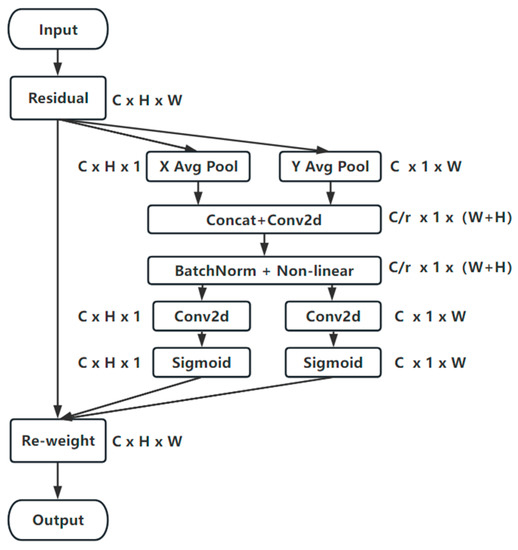 Firstly, the global average pooling value is decomposed. The input feature map of size C × H × W is pooled into X and Y directions, and feature maps of sizes C × H × 1 and C × H × W are generated. Then, the generated C × 1 × W feature map is transformed and obtained by performing concat, F1 (dimensionality reduction using a 1 × 1 convolution kernel), and activation operations with the C × H × 1 feature map, splitting it along the spatial dimension, and increasing the dimensionality using the convolution kernel, and finally combining it with the Sigmoid activation function to obtain the desired attention vector.