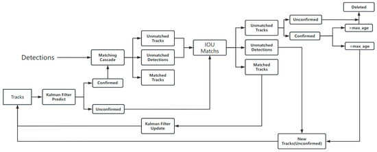 The DeepSort algorithm is an improved version of the Sort target tracking algorithm. The latter mainly includes the Hungarian matching algorithm and Kalman filter, which can combine the tracking and actual detection results to obtain the IOU (Intersection over Union) [35] and calculate the cost matrix to further detect and track the targets in the video. The former adds a discriminative network to the Sort algorithm and complements it with two steps of cascade matching and trajectory predictions, as shown in Figure 7.