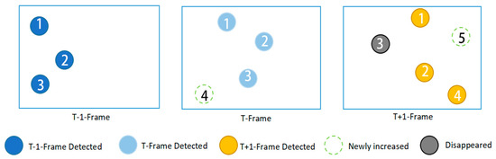 The DeepSort model’s tracking process is presented in Figure 8. The detection results obtained for the YOLOv7 model in this study were delivered to the tracking module to construct a link between the frames. For example, if the wheat appeared in frame T-1, the algorithm gave it an ID value of 1. Thereafter, the wheat ID remained as 1 for its subsequent appearances in other frames.