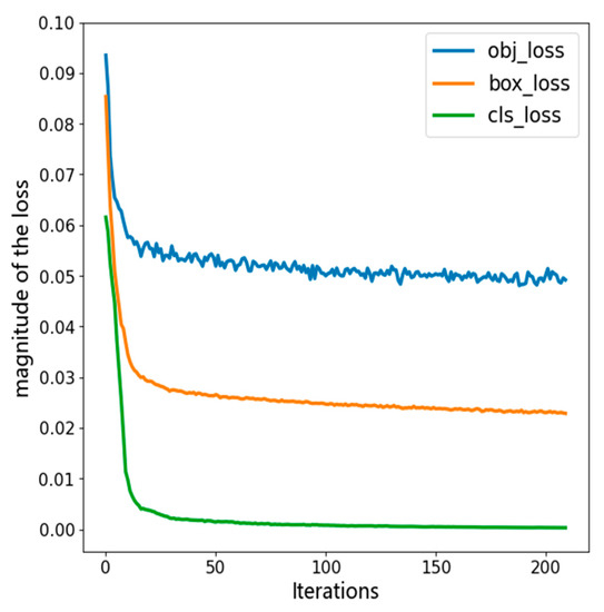 The input image size of the training, test, and validation sets was 640 × 640, and training was performed in the built of improved YOLOv7 model. The convergence of the improved YOLOv7 model is shown in Figure 9. It can be concluded that the category, confidence, and position losses of the improved model converged to lower values, and the position loss decreased by 0.01, compared to the original model. The improved model’s detection algorithm converged better than the original model, presenting a more striking generalization performance.