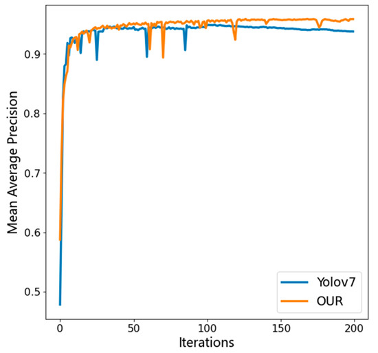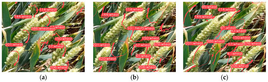 As can be observed in Figure 10, the original YOLOv7 algorithm increases to 93.9% in 100 rounds of mAP and eventually converges at approximately 93.7%; while the algorithm proposed in this paper increased to 95.8% in 100 rounds of mAP and eventually converges at approximately 96.2%, which is a 2.5% improvement over the original YOLOv7 model. In brief, the accuracy of wheat-ear-detection methods can be increased without the participation of redundant parameters when the GCNet network’s architecture for collecting global information is incorporated into the network. Moreover, the introduction of ODConv and CA attention mechanisms enabled the model to consider dynamics in multiple dimensions and capture information across different latitudes, which is more conducive to the localization and identification of wheat sheaves and optimizes the target-detection performance.