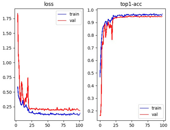 The wheat re-recognition model created by training extracted and preserved the distinguishing features of wheat ears, and re-identified the same wheat ears appearing in different frames. Loss and Top-1 accuracy values were used to perform the evaluation, where Top-1 accuracy indicates the ratio of the total number of correct prediction probabilities of the model to all samples, and a value closer to 1 indicates that the model is more capable of extracting features, i.e., the better the re-identification of wheat ears.