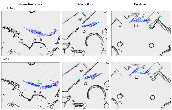 The GRU-Only model’s predictions are momentum-based, and therefore most predicted trajectories are lines of tangents emerging from the observed trajectories. This behavior is evident in the escalator scene (as shown in the top-right plot). The PoPPL’s predictions include some characteristic movements, but the locations of their emergence are less accurate than PORTP.