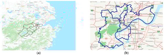 Our GPS records data pertain to the core urban area of Hangzhou City, Zhejiang Province, China, and the position is shown in Figure 1. Consequently, Hangzhou City is taken as an example to verify our urban modeling. Hangzhou is the capital of Zhejiang Province and is located at 118.33–120.50 E longitude, and 29.18–30.51 N latitude. Hangzhou has a long-term resident population of nearly 1.2 million and a gross domestic product (GDP) of 1610 billion yuan; it thus serves as one of the most important cities in the Yangtze River Delta. Compared with the complex mountainous areas in the west, eastern Hangzhou has a higher population and more urban land. In this article, the following six core districts are used as the study area: Shangcheng District, Xiacheng District, Jianggan District, Gongshu District, Xihu District, and Binjiang District. These six districts comprise the old town of Hangzhou, which is still the core business zone of modern Hangzhou, and they are crowded with efficient roads, rail links, tunnels, and flyovers.