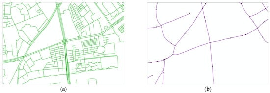 The final topological map of Hangzhou is shown in Figure 2. Figure 2a shows the original map obtained from OSM and is full of redundant lines, e.g., lanes, paths, links, and steps. Figure 2b shows the final topological map, processed through the above steps. In the topological map, the buildings and communities serving as urban functional units are abstracted into a point and projected onto the road network. These projected points, together with the road hubs, form the black points in the figure. The topology edges are realized by simplifying the original map’s road center lines, which are shown as purple lines in the figure.