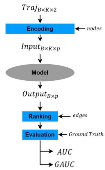 After urban topological modeling and trajectory modeling, the interaction between vehicles and locations is similar in form to the interaction between users and items in recommendation systems. Figure 3 depicts the main process of vehicle trajectory prediction. The trajectory matrix has three dimensions. represents the batch size, represents the length of the trajectory, and the final two represent the point number and the stay time at the point. After the encoding layer, the data are transformed into a three-dimensional feature matrix with dimensions of , , and . is the length of the semantic vector, and the specific value is the semantic component multiplied by the weight. The weight is the normalization of the time spent at the functional point and the ratio of the functional radius. The model was evaluated using the area under curve (AUC) and group AUC (GAUC) of the receiver operating characteristic curve of the participant.