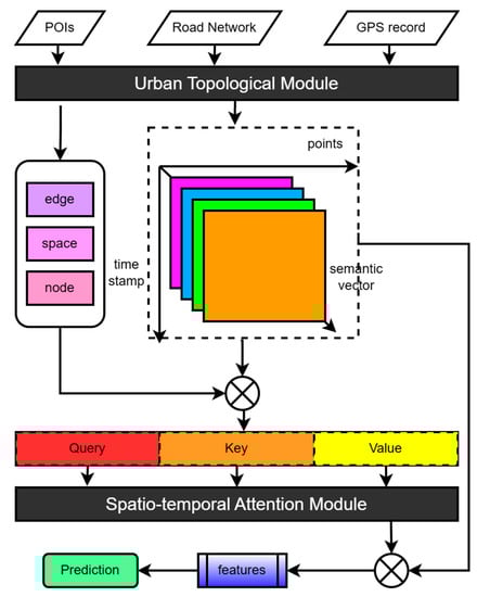 The basic architecture of the urban topology-encoding spatiotemporal attention network is presented in Figure 4. It mainly consists of two parts: the urban topology module and the spatiotemporal attention calculation module. These two modules will be introduced and explained below.