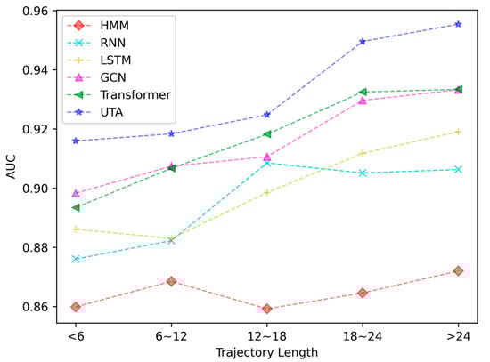 It can be seen from the figure that as the trajectory length increases, the prediction accuracy of each model also increases, with UTA performing the best at each length. The performances of the transformer and the GCN are the closest to that of the UTA. When the trajectory is short, the transformer can only learn limited sequence information, while the GCN can learn sufficient information from the urban topology road network. When the trajectory is long, the spatial performance of GCN is weakened, and the transformer demonstrates strong sequence induction ability. In summary, our UTA model shows significant performance improvement compared with other models for both long and short trajectory sequences.