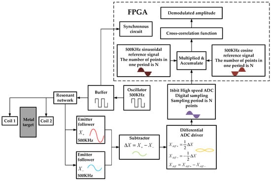 The signal output by the temperature-compensated crystal oscillator is a 500 kHz driving signal. After the signal passes through the resonant network, it drives the two differential probes. The signal output from the probe first enters the emitter follower circuit for amplification. The two amplified signals are subtracted at the next stage to obtain the differential-mode signal measured by the probe, which is input to the high-speed ADC after the differential buffer to complete the digital acquisition. The signal that triggers the FPGA and enters the coils is from same source, which is generated by the buffer circuit. The digital signal processing circuit block diagram is shown in Figure 3.
