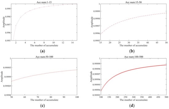 Effect of the accumulation period on output accuracy: (a) 1–15 accumulation cycles; (b) 15–50 accumulation cycles; (c) 50–100 accumulation cycles; (d) 100–200 accumulation cycles.