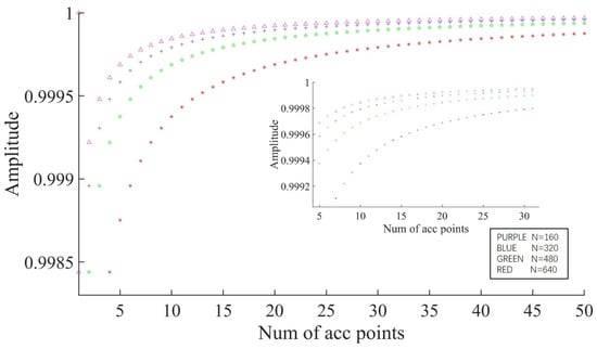 It can be seen from Equation (14) that the sampling frequency of the ADC is also a factor that influences output accuracy. A high sampling frequency obtains more discrete points in one cycle, and more discrete points can accelerate the convergence of the algorithm as follows. We set the number of sampling points to the four values 160, 320, 480 and 640, and plotted the calculated values corresponding to each of the four values for 1–50 accumulation cycles, as shown in Figure 5. From the figure, we can see the influence of the sampling cycle on the convergence speed and the accuracy of the algorithm.