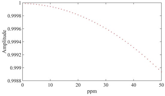 In Equation (21), parameters such as the number of sampling points, the amplitude of the reference signal (which is set equal to 1), and the accumulation period remain constant. Only the frequency of the sampled signal is varied, with each sampling point being changed by 5 parts per million (ppm). By doing so, the relationship between frequency variation and output accuracy can be determined.